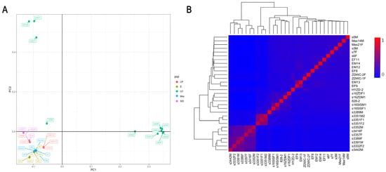 The resequencing data from 31 samples are summarized in Table 1. Each individual reached a depth of more than 28×, with coverage exceeding 90.00% of the whole genome. Q20 scores were generally greater than 90.00%, while Q30 scores were generally more than 85.00%, and GC content ranged from 40.00% to 50.00%. Figure 1A illustrats a clear separation between the different breeds. The heatmap of genomic relationships between individuals, as shown in Figure 1B, indicates that individuals from each taxon are largely clustered together.