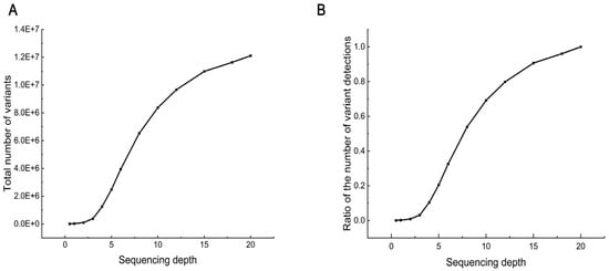 After random down-sampling, the number of SNPs found at each depth showed an approximately S-shaped increase with increasing sequencing depth (Figure 2A), and the variant discovery power at different depths showed the same trend as the number of SNPs. Specifically, when the sequencing depth was less than 3×, the number of SNPs found increased slowly and gradually from almost 8000 to 380,000. Subsequently, the number of SNPs found increased rapidly as the depth increased from 3× to 10×, with the increase slowing after 10×. At 10×, about 8.37 million SNPs were detected, accounting for 69.16% of the variation at 20× sequencing depths (Figure 2B). When the depth reached 15×, the variant detection rate exceeded 90.00%.