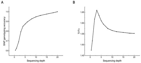 The transitions/transversions (Ti/Tv) ratio was another parameter used to measure the accuracy of genotyping. As shown in Figure 3B, the Ti/Tv ratio did not change significantly. At low depths, the ratio fluctuated greatly. With increased sequencing depth, the ratio gradually tended to stabilize and remained generally unchanged at about 1.55.