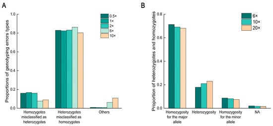 Due to the low accuracy at low sequencing depths, we further analyzed the causes of genotyping errors at five different sequencing depths (0.5×, 1×, 2×, 6×, and 10×). The results indicated that most genotyping errors were due to misclassifying heterozygotes as homozygotes (Figure 4A), accounting for over 80.00% of all error types. We also calculated the proportions of heterozygotes and homozygotes at three sequencing depths (6×, 10×, 20×). Genotyping results were similar at all three sequencing depths, with heterozygotes accounting for approximately 20.00% of the genome-wide genotyping data (Figure 4B). This finding suggests that higher genomic heterozygosity might have contributed to higher genotyping error rates, and that other species with high heterozygosity might face similar challenges at low sequencing depths.