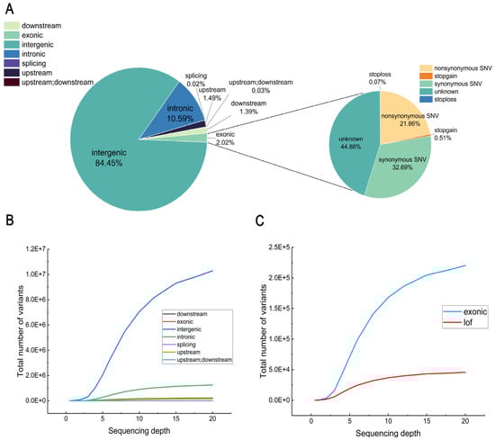 All variants were annotated using ANNOVA (https://annovar.openbioinformatics.org/en/latest/, accessed on 6 March 2024). The results showed that a total of seven variant types were identified in the annotated gene regions, with the highest number of intergenic variants accounting for approximately 84.45%. Intronic variants accounted for 10.59%, and exonic variants accounted for only 2.02% (Figure 5A). We further characterized the types of variants identified as loss-of-function (Lof) in exons, of which non-synonymous single nucleotide variants (SNVs) accounted for a large proportion. The stopgain and stoploss types accounted for only a small fraction (Figure 5A). The number of variants in different regions of the genome increased with sequencing depth (Figure 5B), as did the number of exon variants and Lof findings (Figure 5C). Similar to the total number of SNPs, the number of different types of variants increased rapidly in the early stages and stabilized in the later stages.