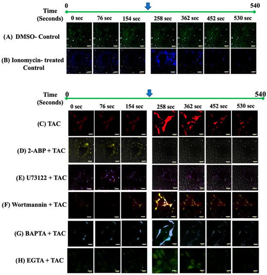 Tacrolimus spiked [Ca2+]i release in live HTR8/Svneo cells. (A–H): Representative photomicrographs of individual live HTR8/SVneo cells visualized by intravital confocal microscopy depicting the intracellular contents of Ca2+ in DMSO-treated control ((A): green), ionomycin ((B): blue), TAC-treated ((C): red), 2-APB + TAC ((D): yellow), U73122 + TAC ((E): purple), Wortmannin + TAC ((F): orange), BAPTA + TAC ((G): turquoise) and EGTA + TAC ((H): green), respectively. The timeframe for Ca2+ imaging was for a total of 540 s. [Ca2+]i release was spiked at the end of minute 3 of live-image tracing (depicted by the blue arrow) by the addition of ionomycin (B), or TAC alone (C) or in the presence of other inhibitors of [Ca2+]i release and Ca2+ chelators (D–G). Compared to the DMSO-treated (A) and Ionomycin-treated controls (B), the single use of TAC (10 ng/mL) resulted in a significant increase in [Ca2+]i in the HTR8/SVneo cells (compare the intensity of red color in (C) before and after the addition of TAC). The inability of TAC to spike [Ca2+]i-release in the presence of the IP3R antagonist 2-APB (D) suggests a crucial role for IP3R in mediating the [Ca2+]i modulatory actions of TAC. Unexpectedly, the TAC-induced [Ca2+]i-release in HTR8/SVneo cells was unaffected by inhibitory actions of the PLC inhibitor U73122 (E) as well as the potent and specific phosphatidylinositol 3-kinase (PI3-K) inhibitor Wortmannin (F). The intracellular source of the TAC-induced [Ca2+]i-release is confirmed by the use of intracellular [Ca2+]i chelator BPATA (G) and EGTA (H). Scale bars: (A–H) 30 µm; [Ca2+]i is depicted in pseudocolors in (A–H).