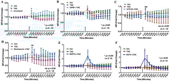 Real-time tracing of [Ca2+]i-release in live HTR8/SVneo cells. (A–F): Fold change in Mean Fluorescence Intensity (MFI) of Fluo-4 as a measurement of [Ca2+]i-release in HTR8/SVneo cells receiving TAC (A) in the presence and absence of the [Ca2+]i-release inhibitors (2-APB: (B), U73122: (C), Wortmannin: (D)), as well as the Ca2+chelators BAPTA (E), and EGTA (F). (A) depicts the influence of TAC administration on spiking [Ca2+]i-release (black arrow) in a comparable intensity to that of the calcium ionophore Ionomycin. (B) depicts pre-incubation with the IP3R inhibitor 2-APB significantly suppressed TAC-induced [Ca2+]i-release in HTR8/SVneo cells (p < 0.05). (C,D): Unlike the suppressive effects of the 2-APB on TAC-induced [Ca2+]i-release, the inhibition of the phospholipase C (PLC) or the phosphatidylinositol 3-kinase (PI3K) by use of the compound U73122 (C) and Wortmannin (D) did not restrict this cellular action of TAC. In (E,F), the spiked TAC-induced [Ca2+]i-release in HTR8/SVneo cells concomitantly treated with the intracellular and extracellular calcium chelators BAPTA (E) and EGTA (F) suggests the release of [Ca2+]i is from the intracellular stores, namely the endoplasmic reticulum. In (A–F), HTR8/SVneo cells were pre-incubated for 10 min with the [Ca2+]i-release inhibitors prior to the administration of TAC. Real-time tracing of [Ca2+]i-release in Ionomycin-treated HTR8/SVneo cells was included in (A) for a comparison. Black arrows in (A–F) depict spiked [Ca2+]i-release. The time recording was 10 min.