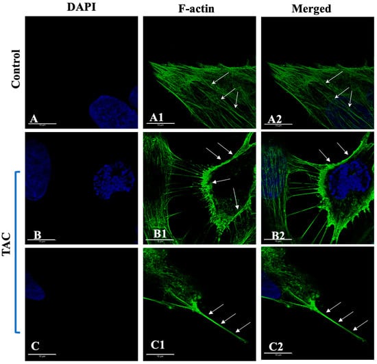 Tacrolimus influences F-actin cytoskeletal re-arrangement in the human-derived first-trimester extravillous trophoblast cells. (A–C): Single cell confocal images of control (A) and TAC-treated HTR8/SVneo cells (B,C) labeled with the CellMask GreenTM Actin tracking stain. F-actin is mostly distributed in the form of stress fibers running across the cell body of untreated cells (white arrows in (A1,A2)). 10 min pre-incubation with TAC resulted in a global reorganization of the F-actin filaments manifested in the formation of cortical fibers (white arrows in (B1,B2)). Notably, filopodia-like structures (white arrows in (C1,C2)) were observed among TAC-treated HTR8/SVneo cells evidently demonstrating a tangible outcome of the influence of TAC on F-actin cytoskeletal reorganization suggestive of cell motility. Green: CellMask GreenTM-labled F-actin, Blue: DAPI-stained nuclei. Scale bars: (A–C) 10 µm. Nuclei were counterstained with DAPI in (A–C).