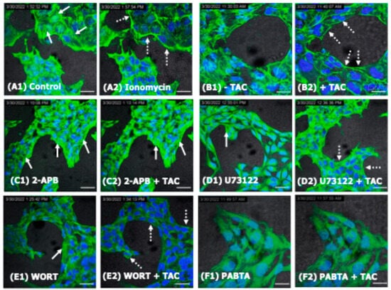 The influence of TAC on the structural reorganization of the actin cytoskeleton in HTR8/SVneo cells was recorded in real time using control and treated live HTR8/SVneo cells and the cell-permeable F-actin marker CellMask GreenTM actin tracking stain. As depicted in Figure 3, as opposed to the prominent distribution of F-actin stress fibers in the untreated HTR8/SVneo cells (Figure 3(A1,A2)), the foremost action of the single use of TAC is a major structural reorganization of F-actin cytoskeleton predominantly characterized by the formation of cortical fibers in these cells (Figure 3(B1,B2)). Notably, this core structural rearrangement of the F-actin cytoskeleton in HTR8/SVneo cells was associated with the formation of filopodia-like membrane protrusions within 10 min of the administration of TAC (Figure 3(C1,C2)). Moreover, comparable to the actions of the calcium ionophore ionomycin (Figure 4(A1,A2)), a time-dependent cytoskeletal reorganization of F-actin was also successfully induced and visualized in the HTR8/SVneo cells in response to TAC (Figure 3(B1,B2)). Remarkably, as seen in Figure 4(A1,A2,B1,B2), both treatment conditions favored a predominant cortical F-actin redistribution in HTR8/SVneo cells. However, unlike the pre-incubation with U73122 (Figure 4(D1,D2)) and Wortmannin (Figure 4(E1,E2)), the presence of 2-APB (Figure 4(C1,C2)) and PABTA (Figure 4(F1,F2)) was detrimental for the detection of F-actin cellular reorganization in these trophoblast cells and dictated a dependence of TAC actions on functional IP3R-signaling pathway in inducing F-actin cytoskeletal reorganization. The recording after the addition of TAC to the inhibitor pre-treated cells was 6 min.