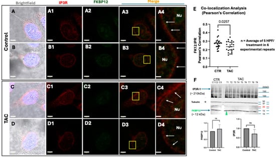 Tacrolimus negatively influenced the co-localization of IP3R and FKBP12 in HTR8/SVneo cells. (A–E): Representative confocal images for the immunofluorescent detection of IP3R-1 ((A1–D1): red *) and FKBP12 ((A2–D2): green *) and their co-localization ((A3–D4); firey orange, and co-localization analysis bar graphs in (E)) in PFA-fixed monolayers of control (DMSO-treated) and TAC-treated HTR8/SVneo cells depicting a significant reduction (p = 0.025) in the Pearson’s correlation coefficient of mean fluorescent intensities (MFI) of the co-localization of these two protein components of the ER [Ca2+]i-release channels after 1 h of exposure to TAC (E). Indeed, Pearson’s correlation quantification revealed that IP3R-I and FKBP12 are co-expressed in the same pixel in control cells more than in TAC-treated cells **. Note that the characteristic perinuclear distribution of these two proteins in HTR8/SVeno cells (white arrows in (A4–D4), respectively). (F): representative Western blot (Wb) detection of IP3R and FKBP12 in control (experimental repeats C1–C3 in lanes C1–C3) and TAC-treated (experimental repeats T1–T9 in lanes T1–T9) HTR8/SVneo cells, revealing a preservative effect of TAC in maintaining the levels of these two protein components of the ER [Ca2+]i-release channels in trophoblasts as measured by the lack of a significant fold change in their protein band intensities compared to untreated control cells (p > 0.05). The IP3R-1 bar graphs in (F) exclusively depict the intensities of the Wb protein bands at the 210 kDa molecular weight. Images in (A4–D4) are higher magnifications of the yellow-boxed cellular areas in (A3–D3), demonstrating the peri-nuclear distribution and co-localization of IP3R-1 and FKBP12 in control and TAC-treated HTR8/SVneo cells, respectively. (A,B): Representative brightfield images of control and TAC-treated HTR8/SVEneo cells depicting their general morphology and their blue-colored DAPI-stained nuclei, respectively. Scale bars: (A–D4) 5 µm. Nu (A4–D4): Nuclei. TAC: Tacrolimus. ns in (F): Not statistically significant (p > 0.05). *: Alexa-Fluor 790-conjugated anti-FKBP12 (anti-FKBP12-AF790; mouse anti-human) and Alexa-Fluor 680-conjugated IP3R-I (anti-IP3R-1-AF680; mouse anti-human) primary antibodies were used for the detection of their respective proteins labeled in the confocal images of HTR8/SVneo cells shown in (A1–D4). Due to current technical limitations with the wavelength detection of the 790 fluorochrome, anti-FKBP12-AF790-labeled monolayers of these cells were allowed a brief incubation with FITC-labeled goat-anti-mouse antibody suspension prior to re-incubation with the anti-IP3R-1-AF680 as described in the methods section. **: The quantification was performed by comparing all the individual frames (one cell per frame; four cells per experiment; a total of six experiments; therefore, 24 cells per treatment). Scatter blots in (E) represent the average rate of four cells imaged in randomly selected 5 high-power fields (HPFs) in an experiment (n = 6 plates (30 mm) per treatment).