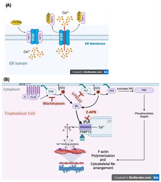 The inositol triphosphate receptor (IP3R) is an intracellular Ca2+ release channel belonging to the ryanodine receptor (RYR) superfamily, which is positioned on the membrane of the endoplasmic reticulum, as illustrated in Figure 6A. Previous studies highlighted the requirement for functional IP3R channels for normal placental development. A report by Uchida et al. (2016) [] revealed defective placental development in an IP3R knockout murine model due to poor trophoblast cell migration []. Remarkably, a recent report by Zheng et al. (2022) [] confirmed the pre-requisite of F-actin cytoskeletal reorganization in the IP3R-mediated regulation of trophoblast cell migration []. The binding of the immunophilins FK506 binding proteins, 12 and 12.6 (FKBP12/12.6), to the ryanodine receptors [RyRs] is reported to stabilize a closed state of their [Ca2+]i-release activity [,,,,]. Indeed, it has been shown in a variety of cellular contexts that the displacement of FKBP12/12.6 from RyRs or mutations that alter FKBP12/12.6-RyR interactions promote a Ca2+ leak by prolonging the prospect and duration of RyR opening [,,,,,]. Previous TAC tacrolimus research demonstrated that it can spike [Ca2+]i-release through its affinity-based binding to FKBP12/12.6 and, subsequently, sequestering it from the FKBP12/12.6-RyR complex, hence elevating its sensitivity to a prolonged [Ca2+]i-release [,,] (illustrated in Figure 6B). The current consensus is that upon binding to FKPB12, TAC tacrolimus can sequester this immunophilin from the RyR complex, thereby increasing the sensitivity of this ionic channel to [Ca2+]i agonists that may include other targets of IP3R and Ca2+ signaling [,]. Data obtained in the present study have provided reproducible experimental evidence supporting the latter notion in showing the immediate dissociation of the FKBP12/IP3R complex within their perinuclear and cytosolic locations in the HTR8/SVneo cells upon a transient 1 h exposure to TAC tacrolimus (Figure 5A–E). However, in a recent study investigating the contribution of the IP3R and RyR to the reported altered endothelial function and plausible mechanisms underlying the immunosuppressant-mediated hypertension and endothelial dysfunction in organ transplant patients, Buckley et al. (2020) [] suggested that the increase in IP3-evoked Ca2+ release generated by TAC tacrolimus is mediated by an effect of the drug on calcineurin rather than FKBP modulation itself []. Although we acknowledge these findings, nonetheless, we agree with the authors’ suggestion that FK506 may inhibit IP3R by a mechanism that could be independent of either FKBP or calcineurin []. This could be true in the face of the fact that TAC tacrolimus binds to other FKBPs, such as FKBP51 and FKBP52, which regulate store-operated Ca2+ entry and some TRP channels through steroid receptor signaling to modulate cell function [,,]. Therefore, we believe that our present data are in agreement with previous studies suggesting that TAC tacrolimus exerts its cellular effects through altered Ca2+ signaling that can be mediated by displacement of FKBP from IP3R, or through FK506-induced inhibition of calcineurin, or TAC tacrolimus could be indirectly facilitating [Ca2+]i release via its bindings to other FKBPs in a variety of cellular contexts. Collectively, our data suggest that TAC tacrolimus can mediate its immune-independent actions in trophoblast cells through influencing [Ca2+]i ER release and the concomitant CaAR-induced dynamic global F-actin cytoskeletal rearrangement in treated HTR8/SVneo cells within a relatively short period of time of less than 60 min []. Nonetheless, further research into discerning the role of the phosphatase calcineurin in the presently reported TAC-induced [Ca2+]i homeostasis in trophoblast cells is warranted.