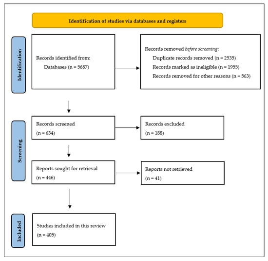 A total of 634 articles advanced to the screening stage, where their abstracts were reviewed. Of these, 188 studies that did not meet this study’s objectives were excluded. The remaining 446 articles were read in full, and after assessing their eligibility, 41 were excluded. Ultimately, 405 articles were included in this systematic review.