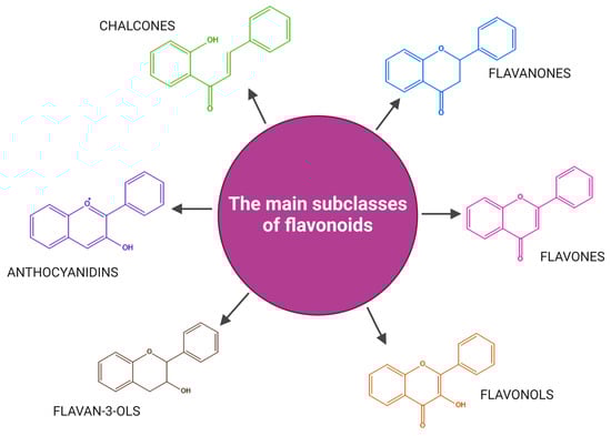 According to the number of hydroxyl or methyl groups attached to the aromatic ring B, the nature of the carbon atom of the C ring, and the degree of unsaturation of the heterocyclic ring C flavonoids can be classified into the following six subclasses, as illustrated in Figure 4 [,,,]: