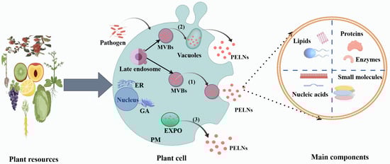 PELNs contain lipids, microRNAs (miRNAs), proteins, small molecules, and other bioactive components [25,26,27,28]. Table 1 summarizes the composition of and analysis techniques for PELNs from a number of plants.