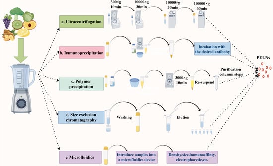 Currently, techniques for extracting ELNs from animal-cell sources are relatively well established. However, extraction methods to obtain high-purity PELNs are relatively limited [64]. Before extracting PELNs, the active parts of the plant must be washed and then subjected to some simple treatments [65]. PELNs can be extracted from the seeds, roots, stems, fruits, leaves, and other parts of different plants [66,67,68]. Juicy fruits, such as grapefruit and strawberries, can be squeezed directly after washing to obtain an initial sample of PELNs [69]. Plant leaves and seeds, such as tea and coffee beans, require a vacuum infiltration centrifugation procedure in an infiltration buffer to obtain in vitro fluids before subsequent operations. The roots and stems of plants such as ginseng and ginger are hard and juicy, and a combination of a grinder and a juicer is required to extract PELNs from such plants, with the addition of an appropriate amount of PBS (phosphate-buffered saline) to the process [70]. The liquid obtained by filtration is subjected to subsequent extraction operations. Figure 2 shows the separation technique for PELNs. These methods include ultracentrifugation (Figure 2a) [66,67,68], immunoaffinity capture (Figure 2b) [71], polymer precipitation (Figure 2c) [72], size-exclusion chromatography (Figure 2d) [73], and microfluidic techniques (Figure 2e) [74]. Advances in these techniques have led to new insights into the structure and function of ELNs [75]. Currently, ultracentrifugation and sucrose density gradient centrifugation are the most commonly used ultracentrifugation techniques [76,77]. Combining ultracentrifugation with density gradient centrifugation and immunoaffinity capture techniques is commonly used for the isolation and extraction of PELNs [78]. However, each isolation and purification method has its advantages and disadvantages [65]. Table 2 lists several methods for extracting PELNs and their advantages and disadvantages.