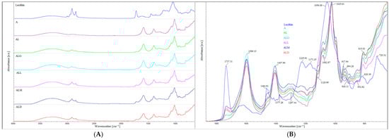 Fourier-transformed infrared (FT-IR) spectroscopy was used to identify the functional groups and was carried out to observe the structural interactions of alginate–lecithin films enriched with coffee extracts. Figure 1A,B displays six FTIR spectra of the films with (and without) the addition of the coffee extracts.