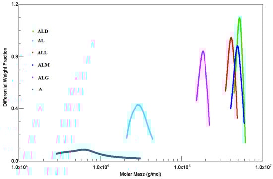 The differential weight fraction vs. molecular weight plots for the samples of alginate, alginate/lecithin and alginate/lecithin films with the coffee extracts are illustrated in Figure 2.