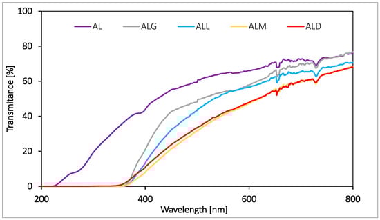 The transmission spectra of studied films including reference film (AL) and the films with the addition of green coffee (ALG), light- (ALL), medium- (ALM) and dark-roasted (ALD) coffee extracts.