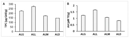 The content of TPC in the studied films is shown in Figure 4A. It was stated that alginate/lecithin films enriched with coffee extracts differed significantly in terms of this parameter. The values of TPC for the tested samples, expressed in GAE, ranged from 172.83 to 275.12 μg GAE per 1 g of film. The ALL film was characterized by the highest TPC (275.21), while the ALD was the lowest (146.34). Taking into account the content of antioxidants, the ALL film was characterized by the most favorable proportion between chlorogenic acids and melanoidins, both responsible for the ability to reduce the Folin–Ciocalteu reagent by components of extracts added to the films. The tested films were also characterized by a varied AA measured in reaction with DPPH radicals (Figure 4B). The ALL film had the highest AA value (1.652 µM/T), while the ALD film had the lowest (0.827 µM/T), respectively. A statistically significant correlation was found between the content of the TPC and AA of the films (r = 0.981). Based on the results obtained, it can be concluded that an addition of coffee extracts to alginate/lecithin films significantly affects the antioxidant properties of this type of edible film.