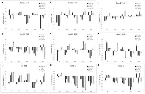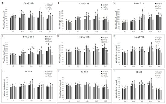 Effect of 24, 48 and 72 h exposition to different concentrations (100–0.1 μg/mL) of alginate–lecithin films (AL) and films with the addition of green, light-, medium-, dark-roasted coffee extracts (ALG, ALL, ALM and ALD) on cell viability in Caco-2 (A–C), HepG2 (D–F) and BJ (G–I). Data are presented as means ± SD. Statistically significant differences were investigated using one-way ANOVA followed by Tukey’s post hoc. Columns with the same letters are not significantly different (p > 0.05). * Differences statistically significant relative to the control sample when p < 0.05 (t-test).