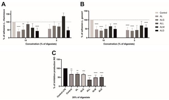 In the cell viability analysis only in the Caco-2 cell line, after a 72 h treatment with 10 μg/mL of digested AL film, a statistically significant decrease in cell viability (% of control: 87.96 ± 4.31), as compared to untreated cells (negative control), was observed (Figure 6C).