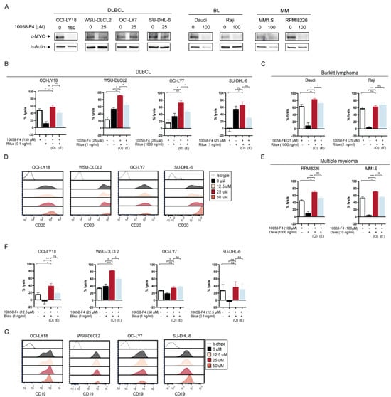 Combination of MYC inhibitor 10058-F4 with conventional and T cell-redirecting therapeutic antibodies increases tumor cell kill in various B-cell malignancies. (A) Immunoblot analysis of MYC protein and β-actin levels after treatment with indicated concentrations of 10058-F4 for 96 h (WSU-DLCL2, OCI-LY7 and SU-DHL-6), 48 h (OCI-LY18, Daudi, Raji and MM1.S) or 24 h RPMI8226. (B,C) Diffuse large B-cell lymphoma (DLBCL) cell lines (B) and Burkitt lymphoma (BL) cell lines (C) were pre-incubated with indicated concentrations of 10058-F4 (12.5–150 μM) for 96 h (WSU-DLCL2, OCI-LY7 and SU-DHL-6) or 48 h (Daudi and Raji) and thereafter incubated with predetermined concentrations of rituximab (ritux, 1–1000 ng/mL) in the presence of PBMCs obtained from healthy donors as effector cells (E:T ratio of 25:1) for 16 h. Tumor cell lysis was assessed using a bioluminescence-based cytotoxicity assay. Cell viability was calculated based on untreated cells. Observed [O] lysis upon combined treatment was compared to the expected [E] lysis, which was calculated according to the BLISS model (% expected lysis = ((% lysis 10058-F4/100) + (% lysis antibody/100)) − ((% lysis 10058-F4/100) × (% lysis antibody/100)) × 100). The null hypothesis of “additive effects” was rejected if the observed values were significantly different than the expected values. (D) Representative flow-cytometry histograms depict CD20 expression in DLBCL cell lines after 24 h of treatment with indicated concentrations (0–50 μM) of 10058-F4. Dotted line represents isotype staining control. (E) Multiple myeloma (MM) cell lines were pre-incubated with indicated concentrations of 10058-F4 (12.5–150 μM) for 48 h (MM1.S) or 24 h (RPMI8226) and thereafter incubated with predetermined concentrations of daratumumab (dara, 10–1000 ng/mL) in the presence of PBMCs obtained from healthy donors as effector cells (E:T ratio of 25:1) for 16 h. Details as in (B). (F) DLBCL cell lines were pre-incubated with indicated concentrations of 10058-F4 (12.5–150 μM) for 48 h (OCI-LY18) or 96 h (WSU-DLCL2, OCI-LY7 and SU-DHL-6) and thereafter incubated with predetermined concentrations of blinatumomab (blina, 0.1–1 ng/mL) in the presence of PBMCs obtained from healthy donors as effector cells (E:T ratio 10:1) for 24 h. Details as in (B). (G) Representative flow-cytometry histograms depict CD19 expression in DLBCL cell lines after 24 h of treatment with indicated concentrations (0–50 μM) of 10058-F4. Dotted line represents isotype staining control. Data are represented as mean ± SEM of 2–3 technical replicates. * p < 0.05; ** p < 0.01; *** p < 0.001; **** p < 0.0001; ns not significant.