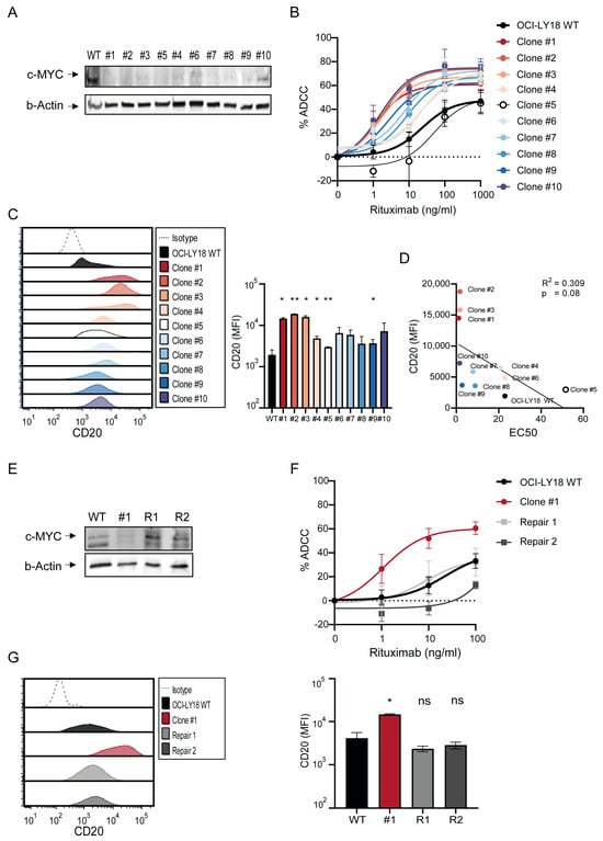 MYC downregulation increases rituximab-dependent cellular cytotoxicity and increases CD20 expression. (A) Immunoblot analysis of MYC protein and β-actin levels in OCI-LY18 wild type (WT) and MYC-targeted clones. Immunoblot is representative of three independent experiments. (B) OCI-LY18 WT (black) and MYC-targeted clones (colored) were incubated with indicated concentrations of rituximab (x-axis) in the presence of PBMCs obtained from healthy donors as effector cells (E:T ratio 40:1) for 16 h. Percentage of tumor cell lysis is depicted on the y-axis. Tumor cell lysis was assessed using a flow cytometry-based cytotoxicity assay. Cell lysis was calculated within each cell line compared to untreated cells. Data are presented as mean ± SEM of at least 3 technical replicates. (C) Representative flow-cytometry histogram depicting CD20 expression (left) and corresponding mean fluorescent values (MFI) (right) in OCI-LY18 WT (black) and MYC-targeted clones (colored). Expression data are representative histograms of at least 2 technical replicates. (D) Correlation plot of rituximab-induced EC50 values (x-axis) versus CD20 expression (as MFI values [y-axis]) in OCI-LY18 WT (black) and MYC-targeted clones (colored). (E) Immunoblot analysis of MYC protein and β-actin levels in OCI-LY18 WT and MYC-targeted clone #1 and MYC-repaired subclones (R1 and R2). Immunoblot is representative of three independent experiments. (F) Cytotoxicity of OCI-LY18 WT (black) and MYC-targeted clone #1 (red) and MYC-repaired subclones (grey) following rituximab treatment. Details as in (B). (G) Representative flow-cytometry histogram depicting CD20 expression (left) and corresponding mean fluorescent values (MFI) (right) in OCI-LY18 WT (black) and MYC-targeted clone #1 (red) and MYC-repaired subclones (grey). * p < 0.05; ** p < 0.01; ns not significant.