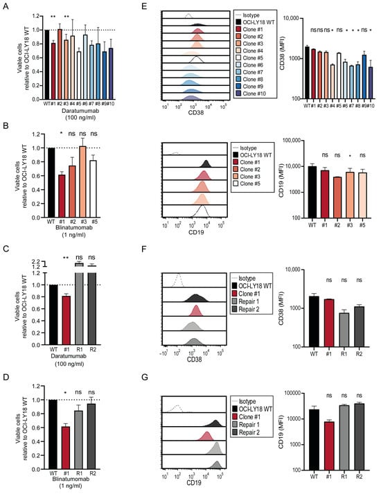 MYC downregulation increases lysis by conventional and T cell-redirecting therapeutic antibodies independent of target antigen upregulation. (A) OCI-LY18 wild type (WT, black) and MYC-targeted clones (colored) were incubated with 100 ng/mL daratumumab (x-axis) in the presence of PBMCs obtained from healthy donors as effector cells (E:T ratio 40:1) for 16 h. Percentage of tumor cell lysis is depicted on the y-axis. Tumor cell lysis was assessed using a flow cytometry-based cytotoxicity assay. Cell viability was calculated based on untreated cells (0 ng/mL), and the percentage of viable cells of the treated is normalized compared to OCI-LY18 WT. Data are presented as mean tumor cell lysis ± SEM of 3–4 independent experiments performed in duplicate. * indicates p < 0.05; ** p < 0.01, ns not significant. (B) OCI-LY18 WT (black) and a representative selection of MYC-targeted clones (colored) were incubated with 1 ng/mL blinatumomab in the presence of PBMCs obtained from healthy donors as effector cells (E:T ratio of 10:1) for 24 h. Details as in (A). (C) LY18 WT (black) and MYC-targeted clone #1 (red) and MYC-repaired subclones (grey) were incubated with 100 ng/mL daratumumab or blinatumomab in the presence of PBMCs obtained from healthy donors as effector cells (E:T ratio 40:1 (daratumumab) or 10:1 (blinatumomab)) for 16 h (daratumumab) or 24 h (blinatumomab). Details as in (A). (D) Representative flow-cytometry histograms depicting CD38 and CD19 expression in OCI-LY18 WT (black) and MYC-targeted clones (colored). (E–G) Representative flow-cytometry histograms depicting CD38 expression and CD19 expression (left) and corresponding mean fluorescent values (MFI) (right) in OCI-LY18 WT (black) and MYC-targeted clone #1 (red) and MYC-repaired subclones (grey). Expression data are representative histograms of at least 2 technical replicates.