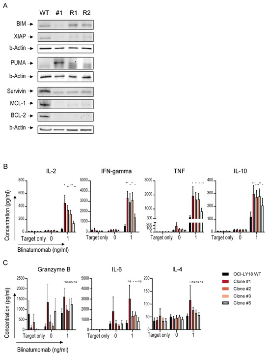 Mechanisms by which MYC mediates escape from conventional antibody and T cell-redirecting therapeutic antibodies. (A) Immunoblot analysis of BIM, XIAP, PUMA, Survivin, MCL-1 and BCL-2 and β-actin levels in OCI-LY18 wild type (WT) and MYC-targeted clone #1 and MYC-repaired subclones (R1 and R2). Immunoblot is representative of two independent experiments. (B,C) IL-2, IFN-γ, TNF, IL-10 (B) and Granzyme B, IL-6 and IL-4 (C) were measured in the cell culture supernatants of OCI-LY18 (black) and MYC-targeted clones (colored) treated with blinatumomab (0 and 1 ng/mL, x-axis) in the presence of PBMCs obtained from healthy donors as effector cells (E:T ratio 10:1) for 24 h. Target only represents the concentration of cytokines secreted in the absence of effector cells. The concentration of cytokines secreted in the supernatant (pg/mL) is depicted on the y-axis. Data represent mean cytokine secretion ± SEM of 3–4 independent experiments performed in duplicate. * p < 0.05; ** p < 0.01; *** p < 0.001; ns, not significant.