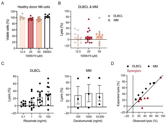 Combination of MYC inhibitor 10058-F4 with conventional therapeutic antibodies increases tumor cell kill in DLBCL and MM tumor samples. (A) Peripheral blood mononuclear cells from n = 8 healthy donors were incubated for 16 h with 0–50 μM 10058-F4 or DMSO control (x-axis). NK-cell viability was determined using flow cytometry-based cytotoxicity assay, and cell viability was calculated based on untreated cells (0 ng/mL). Error bars represent mean +/− SEM. (B) Diffuse large B-cell lymphoma (DLBCL) lymph node samples from n = 12 patients and multiple myeloma (MM) bone marrow samples from n = 3 patients were incubated with 0–50 μM 10058-F4 (x-axis) for 16 h. Details as in (A). (C) DLBLC lymph node samples from n = 12 and MM bone marrow samples from n = 3 patients were incubated with rituximab (in the case of DLBCL 0–1000 ng/mL) or daratumumab (in the case of MM, 0–10,000 ng/mL, x-axis) in the presence of PBMCs obtained from healthy donors as effector cells (E:T ratio 40:1) for 16 h. Tumor cell lysis was assessed using a flow cytometry-based cytotoxicity assay. Cell viability was calculated based on untreated cells. Bars and error bars represent mean tumor cell lysis ± SEM with mean lysis values of each sample (dots). (D) DLBCL samples from n = 12 patients (circles) and MM samples from n = 3 patients (squares) were incubated with 25 μM 10058-F4 and 100 ng/mL rituximab (DLBCL) or daratumumab (MM) in the presence of PBMCs obtained from healthy donors as effector cells (E:T ratio of 40:1) for 16 h. Tumor cell lysis was assessed using a flow cytometry-based cytotoxicity assay. Cell viability was calculated based on untreated cells. Observed [O] lysis upon combined treatment (x-axis) was compared to the expected [E] lysis (y-axis), which was calculated according to the BLISS model (% expected lysis = ((% lysis 10058-F4/100) + (% lysis antibody/100)) − ((% lysis 10058-F4/100) × (% lysis antibody/100)) × 100). The null hypothesis of “additive effects” was rejected if the observed values were significantly different than the expected values.