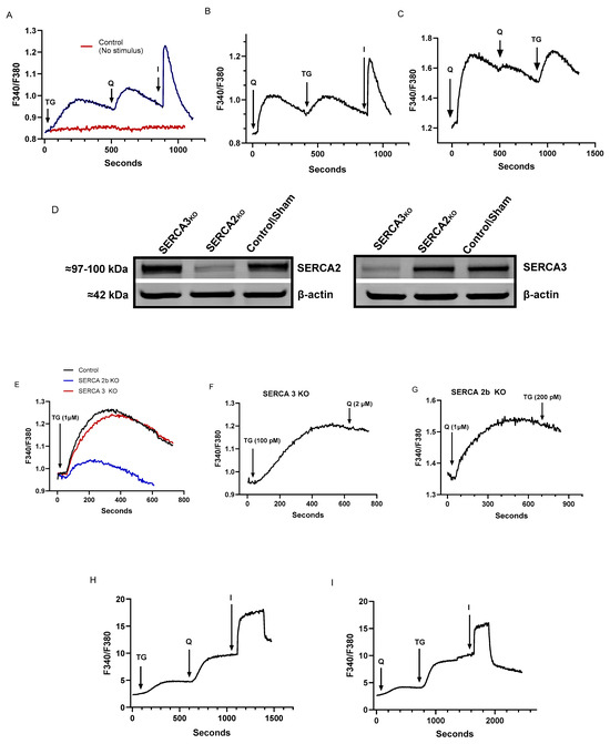 Low concentrations of the SERCA blockers thapsigargin (TG) and 2,5, di-(tert-butyl) 1,4-benzohydroquinone (tBHQ) can specifically induce Ca2+ release from distinct Ca2+ stores in Jurkat and rat T lymphocytes. For A and B, Jurkat T lymphocytes were loaded with Fura-2 and suspended in Ca2+-free media (balanced salt solution plus 2 mM EGTA). (A), Jurkat cell Ca2+ release responses induced by the sequential application (blue trace, arrows) of TG (100 pM), tBHQ (Q, 1 μM), and ionomycin (I, 1 μM) as determined by the ratio of fluorescence changes at 340 and 380 nm (F340/380). Red trace shows representative baseline fluorescence in absence of stimulus (B), the same experiment as in (A) but with the reverse application to Jurkat cells of tBHQ (Q, 1 μM), TG (100 pM), and ionomycin (I, μM). (C), the same experiment as in (B) but with consecutive tBHQ applications (Q, 2 μM) to deplete the tBHQ pool, followed by TG application (100 pM). (D), Western blot image of CRISPR-Cas9 knockout of the SERCA 2b and SERCA 3 Ca2+-ATPase isoforms in Jurkat lymphocytes (see methods). Figure shows the approximate molecular weight of the SERCA proteins and β-actin protein bands as controls. (E), SERCA 2b (blue trace) and SERCA 3 (red trace) knockout and control (black trace) Jurkat lymphocytes were loaded with Fura-2, and Ca2+ release responses were induced, as in (A), to TG (1 μM). (F), SERCA 3 knockout Jurkat lymphocyte Ca2+ responses were stimulated with TG (100 pM) followed by tBHQ (Q, 2 μM) as in (A). (G), SERCA 2b knockout Jurkat lymphocyte Ca2+ responses were stimulated with tBHQ (Q, 1 μM) followed by TG (200 pM) as in (B). (H), Rat spleen T cells loaded with Fura 2 and stimulated with TG (100 pM), tBHQ (Q, 1 μM), and ionomycin (I, 1 μM) in a balanced salt solution (HBSS, see methods) containing Ca2+. (I), Rat spleen T cells stimulated with tBHQ (Q, 1 μM), TG (100 pM), and ionomycin (I, 1 μM) in Ca2+-containing media (HBSS). Fluorescence traces shown are representative of four to ten separate experiments.