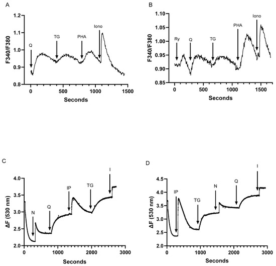 To examine the intracellular Ca2+ store profile in T lymphocytes more closely, we conducted experiments using permeabilized Jurkat T cells, allowing investigation of direct Ca2+ release responses induced by agonists impermeant to the plasma membrane. For these experiments, we used nicotinic acid adenine dinucleotide phosphate (NAADP) to release Ca2+ from RyR-sensitive stores and the direct application of IP3 to release Ca2+ from TCR (PHA)-coupled IP3R-sensitive stores in addition to the SERCA blockers and ionomycin. Figure 2C shows the detection of Ca2+ release from internal pools by the sequential application of NAADP (peak ΔF: 0.55 ± 0.03), tBHQ (ΔF: 0.59 ± 0.04), IP3 (ΔF: 0.49 ± 0.02), TG (ΔF: 0.46 ± 0.05), and ionomycin (ΔF: 0.31 ± 0.02). Figure 2D shows that regardless of the order of application, these Ca2+ release activators can induce release from five distinct intracellular storage sites. Thus, Figure 2C,D confirm the results observed from intact cell experiments, indicating the presence of five releasable Ca2+ pools in T lymphocytes.