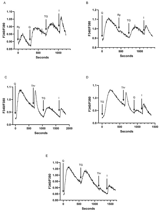 Figure 1B shows a similar experimental outcome where we reversed the order of application of the SERCA blockers, adding tBHQ first followed by TG addition. This result is consistent with the interpretation that the drugs used at these concentrations are revealing that the SERCA 2b and SERCA 3 regulated Ca2+ stores represent separate units of Ca2+ release in the Jurkat lymphocyte, given Ca2+ release responses are similar in magnitude (tBHQ: 0.18 ± 0.06, TG: 0.08 ± 0.003 ratio units, n = 6) and independent of the order of application of the SERCA blockers. We obtained additional evidence that the SERCA blockers are indeed releasing Ca2+ from distinct storage sites by depleting the tBHQ-releasable pool with higher tBHQ levels (2 μM), revealing that the TG-releasable store remains essentially unaffected in this sequence (Figure 1C, n = 4). As mentioned, there is a strong imperative to keep TG levels low in these experiments to maintain specificity for SERCA 2b blockade [32,36,37,38]. Thus, in contrast to Figure 1C, we could not effectively deplete the TG-releasable Ca2+ store without affecting tBHQ-induced release given that increasing TG levels inhibits SERCA3 pumps due to the general high potency for TG-induced inhibition on all SERCA isoforms.
