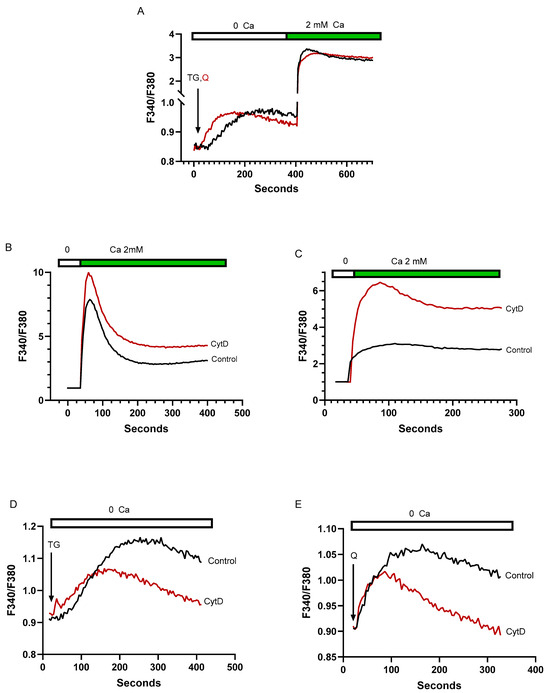T lymphocyte SERCA 2b and SERCA 3-regulated Ca2+ stores reveal similar sensitivities to cytoskeletal disruption with enhanced Ca2+ influx responses and reduced Ca2+ release activity. For (A–E), Jurkat T lymphocytes were loaded with Fura-2 and suspended in Ca2+-free media (balanced salt solution plus 2 mM EGTA). (A). Cells were suspended in Ca2+-free conditions (open bar) and stimulated (arrow) with TG (100 pM) or tBHQ (Q, 1 μM). After approximately 400 s of Ca2+ release activity, Ca2+ levels were increased to 2 mM to elicit Ca2+ influx responses (green bar). (B), TG, and (C), tBHQ-induced Ca2+ influx responses in cell populations pre-incubated for 60 min in the presence (red trace) or absence (black trace) of cytochalasin D (10 μM). (D,E) Jurkat lymphocytes suspended in Ca2+-free media were stimulated with TG (D, 200 pM) and tBHQ (E, 2 μM) in the presence (red trace, CytD) or absence (black trace, Control) of cytochalasin D (60 min pre-incubation, 10 μM). Fluorescence traces shown are representative of four to six individual experiments.