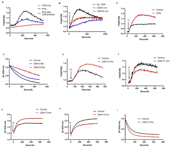 Given CDN1163’s well-described action as an allosteric SERCA pump activator [8], we tested whether the compound may require longer periods of exposure to T lymphocytes to increase SERCA activity globally and augment Ca2+ store levels in SERCA 2b and SERCA 3 regulated stores. Indeed, we observed that longer exposure to CDN1163 (72 h, Figure 6E) increased Ca2+ store levels in the SERCA 2b pool, as revealed by the application of low dose TG (peak ratio units: 0.33 ± 0.06 untreated vs. 0.49 ± 0.07 72 h CDN treated, p < 0.05, n = 7). Yet, surprisingly, Ca2+ store levels in the SERCA 3-regulated stores moved in the opposite direction, exhibiting reduced levels with long-term CDN1163 treatment (Figure 6F), as the low dose tBHQ-induced Ca2+ release responses revealed (peak ratio units: 0.54 ± 0.05 untreated vs. 0.39 ± 0.04 72 h CDN treated, n = 9). Thus, as with the short-term incubation experiments, we also find in the longer-term exposures a remarkable asymmetry in CDN1163’s effects on the SERCA 2b and SERCA 3-regulated Ca2+ stores, with an augmented SERCA 2b and a concomitant reduced SERCA 3 pool with longer CDN1163 treatment. We conducted additional experiments using the permeabilized Jurkat T cell assay to determine if this reversal effect due to longer-term CDN1163 exposure could be observed in direct Ca2+ release assays and on Ca2+ uptake responses. Indeed, we observed the same pattern in these experiments with permeabilized T lymphocytes as was found using intact cells, detecting increased Ca2+ release directly with TG application (Figure 6G) and, conversely, diminished Ca2+ release inducible by tBHQ application (Figure 6H) in cells incubated with CDN1163 (10 μM) for 72 h. Intriguingly, it appears that, like TG and tBHQ, CDN1163 exerts differential effects on SERCA 2b and SERCA 3 Ca2+ pump isoforms. Thus, our findings suggest that the stimulatory effect of CDN1163 on T cell Ca2+ stores is multiplex, requiring prolonged incubation to reverse an initial inhibitory action and augment the SERCA 2b Ca2+ store, yet over the extended incubation period the compound exerts a gradual downregulation of Ca2+ replenishment of the SERCA 3 regulated store. Using the Ca2+ uptake assay in permeabilized cells over a range of different CDN1163 exposure periods, we found that by approximately 12 h Ca2+ uptake activity had been restored (Figure 6I), as well as perhaps slightly elevated (ΔF/s: 7.2 × 10−3 untreated vs. 8.8 × 10−3 CDN 12 h treated, n = 8). This time frame for the restoration of ATP-activated Ca2+ uptake responses in the presence of CDN1163 aligns well with the general time frame required for the shift in Ca2+ release responses to occur in the intact cell experiments.