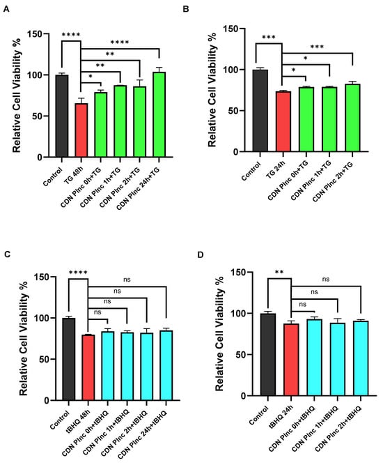 CDN1163 treatment can protect T lymphocytes from thapsigargin but not tBHQ-induced growth inhibition (A,B), Effect of CDN1163 (10 μM) on TG (1 nM) induced growth inhibition of Jurkat T lymphocytes. Cell growth compared to untreated controls (black bars) was determined after the indicated incubation times and experimental conditions. (A). Extending the TG (1 nM) treatment duration to 48 h revealed more substantial effects of CDN1163 in preserving T lymphocyte proliferation as compared to the results in (B). Incubation of Jurkat cells with TG (1 nM) for 48 h resulted in pronounced cell growth inhibition (red bar) in the T cell population compared to untreated controls (black bar, p < 0.0001). Cells were pre-incubated with CDN1163 (10 μM) for 0–2 h with an additional experiment performed using a more extensive (24 h) pre-incubation with CDN1163 followed by TG (1 nM, 48 h) treatment. Increasing the incubation interval to 48 h revealed greater CDN1163 efficacy (0–2 h) in protecting T lymphocyte growth responses to TG (1 nM)-mediated growth suppression, with the 24 h CDN1163 pre-incubation yielding the most pronounced restoration of growth in cells exposed to TG (1 nM, green bars p < 0.0001). (B), Incubation of TG (1 nM) for 24 h (red bar) significantly reduced T cell growth compared to the control population (p < 0.0001). Pre-incubation (PInc) with CDN1163 (10 μM) for 0, 1 and 2 h followed by TG (1 nM) exposure for 24 h led to increasing protection against TG-induced growth suppression (green bars), with maximal protection in this sequence achieved with a 2 h CDN1163 (10 μM) pre-incubation (p < 0.0008). (C,D), Effect of CDN1163 (10 μM) on tBHQ (2 μM) induced growth inhibition of Jurkat T lymphocytes. (C), Extending the tBHQ (2 μM) treatment duration to 48 h resulted in cell growth inhibition (red bar) in the T cell population compared to untreated controls (p < 0.0001). Pre-incubation of the cells with CDN1163 (10 μM) for 0–2 h or even 24 h (blue bars) did not significantly protect against tBHQ-induced growth suppression (D). Cell growth compared to untreated controls (black bar) was determined after 24 h incubation using the indicated experimental conditions. Incubation of tBHQ (2 μM) for 24 h (red bar) produced modest yet significantly reduced T cell growth compared to control incubation (p < 0.0057). Pre-incubation (PInc) with CDN1163 (10 μM) for 0, 1, and 2 h failed to significantly protect T cells in 24 h culture from tBHQ (2 μM)-induced cell growth suppression (blue bars). Asterisks denote statistical significance with * p < 0.05, ** p < 0.005, *** p < 0.001, **** p < 0.0001 and ns is not significant p > 0.05.