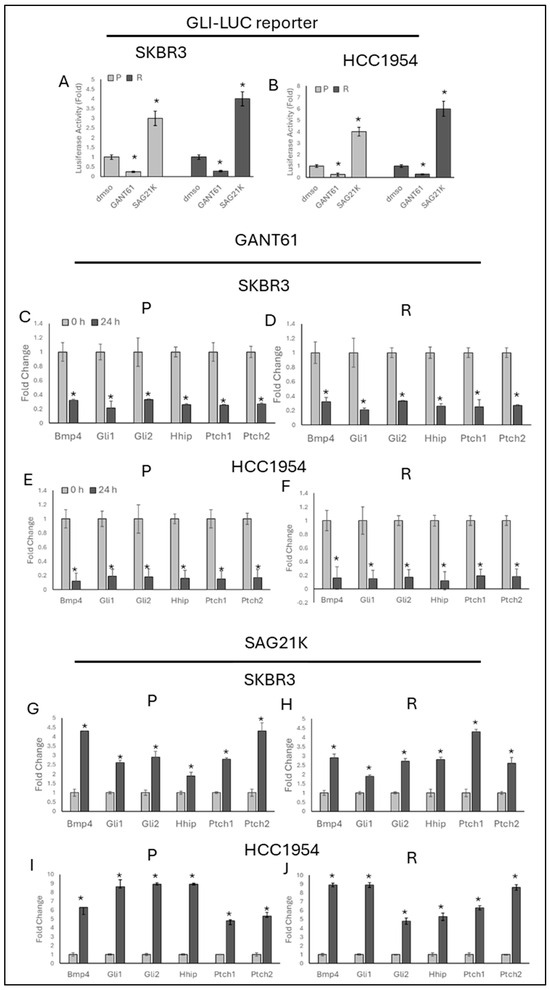 GANT61 decreases Hedgehog signalling while SAG21K increases it in resistant SKBR3 cells. Luciferase activity of the GLI-LUC reporter decreased in the presence of GANT61 and increased in the presence of SAG21K in both parental and resistant cells. The data are presented as follows: (A) SKBR3 and (B) HCC1954 cells showing GLI-LUC activity; (C) GANT61 treatment decreasing Hedgehog-responsive genes in SKBR3-P, (D) SKBR3-R, (E) HCC1954-P, and (F) HCC1954-R cells; (G) SAG21K treatment increasing Hedgehog-responsive genes in SKBR3-P, (H) SKBR3-R, (I) HCC1954-P, and (J) HCC1954-R cells. Student’s t-test was used for statistical analysis. * p ≤ 0.05, n = 3 ± SD.