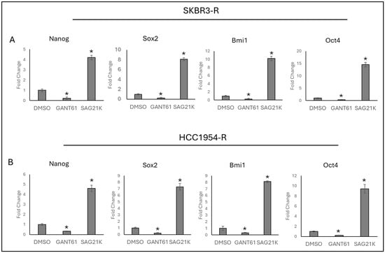Hedgehog inhibition and activation regulate stemness markers in trastuzumab-resistant breast cancer cell lines SKBR3-R and HCC1954-R. (A) Treatment with GANT61 reduces the expression of stemness marker genes, while SAG21K induces their expression in (A) SKBR3-R and (B) HCC1954-R cell lines. R: resistant, (n = 3 ± SD) Statistical analysis was carried out using ANOVA variation test and Tukey’s post hoc test to show significance. Differences are considered significant * p ≤ 0.05.