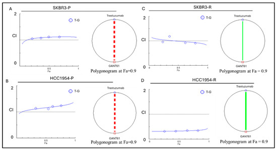 Trastuzumab and GANT61 combination therapy results for combination index plot and polygonogram for SKBR3-P, HCC1954-P, SKBR3-R and HCC1954-R. The red line in (A) SKBR3-R and (B) HCC1954-P polygonogram indicates strong antagonist, The green line with specific thickness in (C) SKBR3-R polygonogram indicates a slightly synergism effect; (D) HCC1954-P polygonogram indicates a synergistic effect. Fa: Fraction affected; Fa = 0.9 means 90% cell death; R: resistant; CI: combination index; CI > 1.1 represents antagonism; CI < 0.9 represents synergism; CI 0.9–1.1 represents an additive effect.