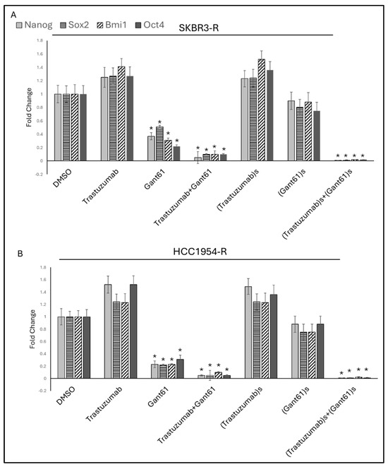 Trastuzumab+GANT61 combination synergistically decrease stemness markers Nanog, Sox2, Bmi1, Oct4, 1 µM GANT61 monotherapy, 1 µM GANT61+trastuzumab combination, and synergistic dose of GANT61+trastuzumab combination significantly decreased Nanog, Sox2, Bmi1, Oct4 (A) in SKBR3-R, (B) in HCC1954-R cells. s(Trastuzumab): Synergistic dose of trastuzumab in combination with GANT61, s(GANT61): Synergistic dose of GANT61 in combination with trastuzumab. R: resistant; (n = 3 ± SD) Statistical analysis was carried out using ANOVA variation test and Tukey’s post hoc test to show significance. Differences are considered significant * p ≤ 0.05.
