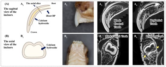 Establishment of external root resorption models in rabbits. (A,B) Sagittal and axial view of the incisors. (A1,B1) Schematic diagrams of the sagittal and axial slices. (A2,B2) Photos of the incisors as viewed from the sagittal and axial direction. (A3,A4) Micro-CT sagittal slices of replanted and control incisors, respectively. (B3,B4) Representative axial image of Micro-CT showing the control incisor and the replanted incisor. The region of ERR is indicated by the yellow arrows. (n = 8).