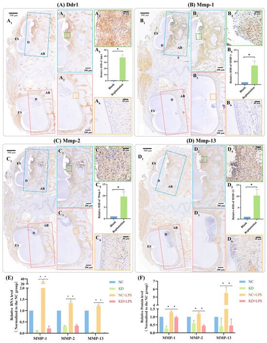 The effects of DDR1 on MMP-1, MMP-2, and MMP-13 expression in vivo and in vitro. (A–D) Representative IHC results of Ddr1, Mmp-1, Mmp-2, and Mmp-13 in the rabbit model. (A1,B1,C1,D1) Representative IHC images of periodontal tissues surrounding the blank control incisor (left) and the replanted incisor (right). (A2,A4,B2,B4,C2,C4,D2,D4) Magnified images of the replanted incisors. (A3,A6,B3,B6,C3,C6,D3,D6) Magnified images of the blank control incisors. (A5,B5,C5,D5) Quantified IHC data for Ddr1, Mmp-1, Mmp-2, and Mmp-13, respectively (all p < 0.05); (E) RT-qPCR results of MMP-1, MMP-2, and MMP-13 with and without DDR1 knockdown. (F) ELISA results of MMP-1, MMP-2, and MMP-13 with and without DDR1 knockdown. Protein concentration in ELISA: MMP-1 in the NC group: 316 pg/mL; MMP-2 in the NC group: 121 pg/mL; MMP-13 in the NC group: 147 pg/mL. ES: enamel space; D: dentin; AB: alveolar bone. Data are shown as mean ± SE. “*” marks a statistical difference between the corresponding groups (one-way ANOVA test, in vivo n = 8, in vitro n = 3).