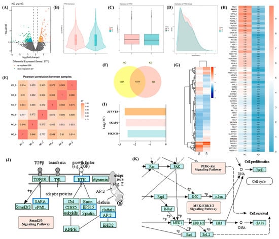 RNA-seq data of the NC group compared with the KD group. (A) Volcano plot of sequencing data. (B–D) Fragments per kilobase of exon per million fragments (FPKM) distribution of all RNA-seq data of the NC and KD groups. (E) Thermal diagram of the correlation coefficient among RNA-seq samples. (F) Venn diagram showing the overlap in the expression profiles of the NC group and the KD group. (G) Heatmap of RNA-seq data showing all 577 differentially expressed genes (p value&log2FC > 1). (H) Part of the heatmap that contains ZFYVE9 (SARA, encoding SMAD anchor for receptor activation), SKAP2 (encoding src kinase associated phosphoprotein 2), and PIK3CB (encoding PI3K) highlighted in the enlarged image. (I) Downregulated gene expression of ZFYVE9, SKAP2, and PI3KCB changes shown with a histogram. The y-axis is the log2FC of the RPKM ratio of the KD group to the NC group (all p < 0.05). (J,K) KEGG pathway enrichment analysis shows that the Smad2/3, MEK-ERK1/2, and PI3K/Akt signaling pathways are suppressed in the KD group. (n = 3).