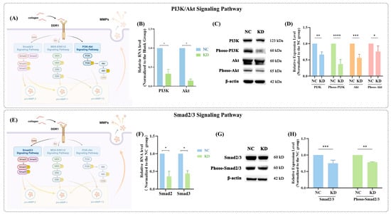 Effects of DDR1 knockdown on PI3K/Akt and Smad2/3 signaling pathways in hPDLCs. (A) The diagram implies that the PI3K/Akt signaling pathway might be one of the downstream pathways of DDR1. (B) According to the RT-qPCR results, after DDR1 knockdown, PI3K and Akt levels clearly descended (p < 0.05), which was consistent with the results of RNA-seq. (C,D) The Western blotting results of PI3K and Akt followed the same pattern as the RT-qPCR (p < 0.05). (E) The diagram shows that the Smad2/3 signaling pathway might be one of the downstream pathways of DDR1. (F) The RT-qPCR results reveal that DDR1 knockdown remarkedly reduced Smad2 and Smad3 expression (p < 0.05), which is indicated in the results of RNA-seq. (G,H) The Western blotting results of Smad2 and Smad3 were consistent with the RT-qPCR results (p < 0.05). Data are shown as mean ± SE. “*” marks a statistical difference between the corresponding groups (* p < 0.05; **, p < 0.01; ***, p < 0.001; ****, p < 0.0001) (one-way ANOVA test, n = 3).