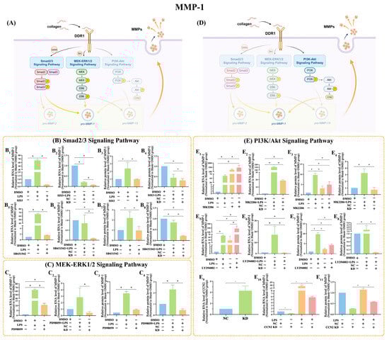 Effects of DDR1 knockdown on MMP-1 via the Smad2/3 and MEK-ERK1/2 signaling pathways. (A) The schematic diagram suggests the pattern by which DDR1 might regulate MMP-1 expression via the Smad2/3 and MEK-ERK1/2 pathways. (B) RT-qPCR and ELISA data indicate that the Smad2/3 signaling pathway has an impact on the expression of MMP-1 (p < 0.05). (C) The Smad2/3 signaling pathway influences the expression of MMP-1, as suggested by RT-qPCR and ELISA data (p < 0.05). (D) The pattern in the schematic diagram implies that DDR1 may control MMP-1 expression via the PI3K/Akt pathway by means of CCN2. (E) MMP-1 expression is influenced by the PI3K/Akt signaling pathway, as shown by the RT-qPCR and ELISA results (p < 0.05). Protein concentration in ELISA: MMP-1 in the Blank + DMSO group: 383 pg/mL; MMP-2 in the Blank + DMSO group: 258 pg/mL; MMP-13 in the Blank + DMSO group: 170 pg/mL. Data are shown as mean ± SE. “*” marked a statistical difference between the corresponding groups (one-way ANOVA test, n = 3).
