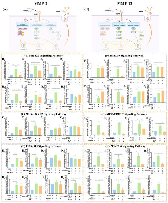 Effects of DDR1 knockdown on MMP-2 via the Smad2/3 signaling pathway and MMP-13 via the MEK-ERK1/2 and PI3K/Akt signaling pathways. (A) The schematic diagram demonstrates how DDR1 controls MMP-2 expression via the Smad2/3 signaling pathway other than the MEK-ERK1/2 and PI3K/Akt signaling pathways. (B) RT-qPCR and ELISA data revealed the regulation of MMP-2 expression via the Smad2/3 signaling pathway. (C) The MEK inhibitor (PD98059) did not inhibit the overexpression of MMP-2 caused by Pg-LPS, as indicated by the results from both RT-qPCR and ELISA (p > 0.05). (D) Both RT-qPCR and ELISA data showed no inhibition of Pg-LPS-induced MMP-2 overexpression by PI3K/Akt inhibitors (MK2206 and LY294002) (p > 0.05). (E) The schematic diagram illustrates that DDR1 affects MMP-13 expression through the MEK-ERK1/2 and PI3K-Akt signaling pathways instead of the Smad2/3 signaling pathway. (F) No statistically significant difference was observed between groups stimulated by Pg-LPS with and without Smad2/3 inhibitors (SIS3 and SB431542) according to RT-qPCR and ELISA results (p > 0.05). (G) According to RT-qPCR and ELISA results, the MEK-ERK1/2 signaling pathway influences MMP-13 expression (p < 0.05). (H) According to RT-qPCR and ELISA results, the PI3K/Akt signaling pathway affects MMP-13 expression (p < 0.05). Protein concentration in ELISA: MMP-1 in the Blank + DMSO group: 383 pg/mL; MMP-2 in the Blank + DMSO group: 258 pg/mL; MMP-13 in the Blank + DMSO group: 170 pg/mL. Data are shown as mean ± SE. “*” marks a statistical difference between the corresponding groups (one-way ANOVA test, n = 3).