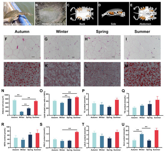 Fat masses in adipose tissue and livers, and lipid indexes in serum of Pelodiscus sinensis in four seasons. (A,B) Images of P. sinensis in non-hibernation (A) and hibernation (B) states under different environmental temperatures. (C–E) The 3D images from X-ray microcomputed tomography (micro-CT) scanning of P. sinensis. For more detail from the micro-CT 3D images, see Supplementary Video S1. (F–I) Representative hematoxylin and eosin (H&E) staining images of adipose tissue from inguinal region. Scale bars, 10 μm. (J–M) Representative oil red O staining images of liver. Scale bars, 10 μm. (N) Quantification of the sizes of individual adipocytes (n = 30). (O) Percentage of lipid droplet area in the total sample area (n = 30). (P–U) The levels of biochemical indexes related to lipid metabolism in serum. TG: triglyceride; TC: total cholesterol; NEFA: non-esterified fatty acid; HDLC: high-density lipoprotein cholesterol; LDLC: low-density lipoprotein cholesterol; Glu: glucose (n = 8). **, p < 0.01 (relative to winter).