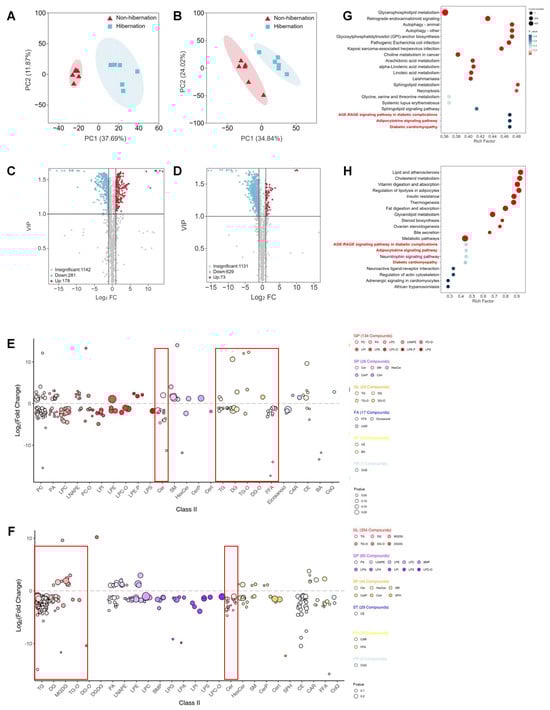 Lipidomic analysis of differentially accumulated lipids (DALs) during non-hibernation and hibernation. (A,B) Principal component analysis (PCA) score plots of adipose tissue (A) and liver (B) lipid profiles. (C,D) Volcano map of lipid detection results in adipose tissue (C) and livers (D). (E,F) The fold change in concentration of all quantified lipid species between non-hibernation and hibernation groups in adipose tissue (E) and livers (F). Each dot represents a lipid species, and the dot size indicates significance. The different lipid classes are color-coded. (G,H) KEGG functional pathway annotation of differentially accumulated lipids in adipose tissue (G) and livers (H).