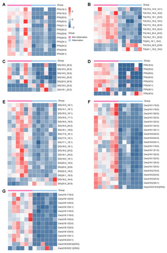Distinct lipid profile of non-hibernating and hibernating P. sinensis. (A–D) Heatmap analysis of FFA species (A), DG species (B), TG species (C), and Cer species (D) in adipose tissue. (E–G) Heatmap analysis of FFA species (E), DG species (F), and Cer species (G) in livers. FFA: free fatty acid; DG: diacylglycerol; Cer: ceramide.
