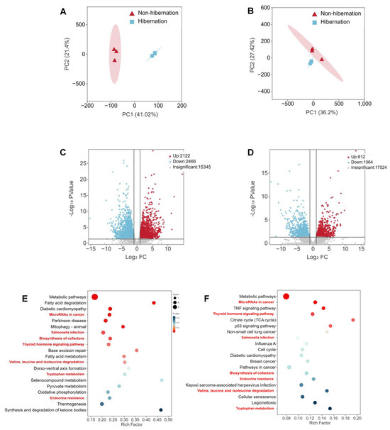 RNA-seq analysis of DEGs during non-hibernation and hibernation. (A,B) Principal component analysis (PCA) score plot of adipose tissue (A) and liver (B) transcription profiles. (C,D) Volcano map of gene detection results in adipose tissue (C) and livers (D). (E,F) KEGG enrichment analysis of differentially expressed genes in adipose tissue (E) and livers (F).