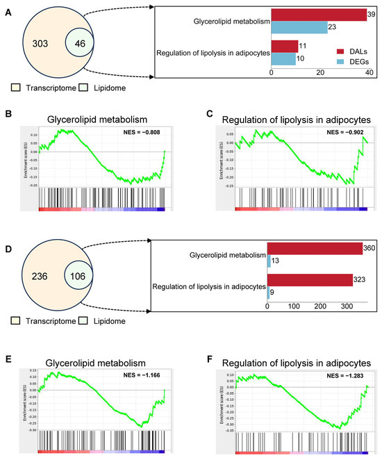 A total of 349 KEGG pathways enriched by differentially expressed genes (DEGs) and 46 KEGG pathways enriched by differentially accumulated lipids (DALs) were comprehensively analyzed in adipose tissue, revealing simultaneous enrichment of glycerolipid metabolism and regulation of lipolysis in adipocytes (Figure 5A). Subsequently, to ascertain whether these two pathways were upregulated or downregulated, gene set enrichment analysis (GSEA) was performed on the differential genes associated with both pathways. The normalized enrichment score (NES) for glycerolipid metabolism was -0.808 (Figure 5B), while the NES for regulation of lipolysis in adipocytes was −0.902 (Figure 5C). Additionally, a comprehensive analysis of the 342 KEGG pathways enriched by DEGs and the 106 KEGG pathways enriched by DALs in liver tissues revealed an NES of −1.166 for glycerolipid metabolism (Figure 5E), and an NES of −1.283 for regulation of lipolysis in adipocytes (Figure 5F). These GSEA results indicated suppression of these metabolic pathways during hibernation in both adipose tissue and livers.