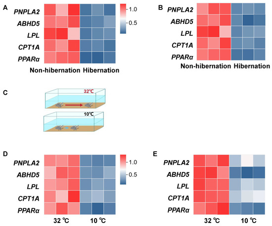 Low-temperature exposure in P. sinensis. (A,B) The relative mRNA expression of lipolysis-related genes (PNPLA2, ABHD5, LPL, CPT1A, and PPARα) in adipose tissue (A) and livers (B) (n = 3) during non-hibernation and hibernation. (C) Schematic of crawling distance measurement of P. sinensis under cold exposure. (D,E) The relative mRNA expression of lipolysis-related genes (PNPLA2, ABHD5, LPL, CPT1A, and PPARα) in adipose tissue (D) and livers (E) from 32 °C group and 10 °C group.