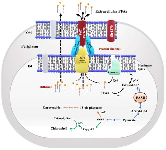 It is commonly recognized in the field that the free fatty acid (FFA)-recycling reaction and their release into the medium biologically balance the excess free fatty acids (FFAs) in cyanobacteria [,,,,]. Free fatty acid (FFA) diffusion and channel protein membranes are the two mechanisms that allow FFA transportation [,]. In the absence of environmental stress, the intracellular free fatty acid may favor random diffusion across cell membranes and move itself into the medium, thus balancing intracellular metabolites. Recent findings have confirmed that weakening cyanobacterial membranes by disrupting the sll1951-gene-encoding S-layer protein efficiently enhanced the secretion of FFAs into the medium [,]. Once within the cells, the S-later proteins are discharged via the Slr1270 membrane protein transporter found in Synechocystis sp. PCC 6803, an Escherichia coli TolC homolog [,]. Given the versatility of TolC, it may be linked to a number of inner membrane complexes that facilitate the transport of a range of substrates involved in the multidrug efflux system and protein secretion [,,]. After deleting the sll0180 and slr2131 genes, which encode the Sll0180 and Slr2131 homologs of AcrA and AcrB in E. coli, respectively, Synechocystis sp. PCC 6803 mutants had higher intracellular FFA levels but lower extracellular FFA levels []. In E. coli, the efflux of FFAs and the multidrug efflux system are additionally carried on by the proteins AcrA and AcrB that interact with TolC [,].