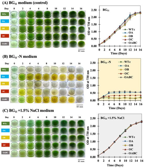 Images of cell-cultured 250 mL flasks and optical density at 730 nm (OD730) of Synechocystis sp. PCC 6803 WTc, OA, OB, OC, and OABC strains cultured under normal BG11 (A), BG11-N (B), and BG11+1.5% (w/v) NaCl (C) conditions for 16 days. The error bars represent standard deviations of means (mean ± S.D., n = 3).